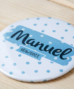 Si los lunares son tu debilidad, te presentamos un modelo de chapa personalizado con nombre y fecha de primera comunión. Dispones de 4 colores a elegir y 4 traseras disponibles: imán, espejo, abrebotellas y alfiler. Un regalo especial para todos tus invitados y familiares, un recuerdo útil y divertido que sin duda, no se quedará olvidado en un cajón.