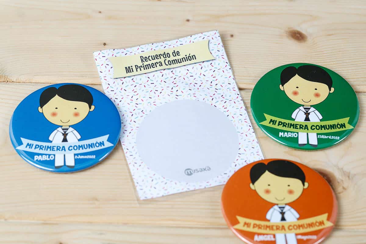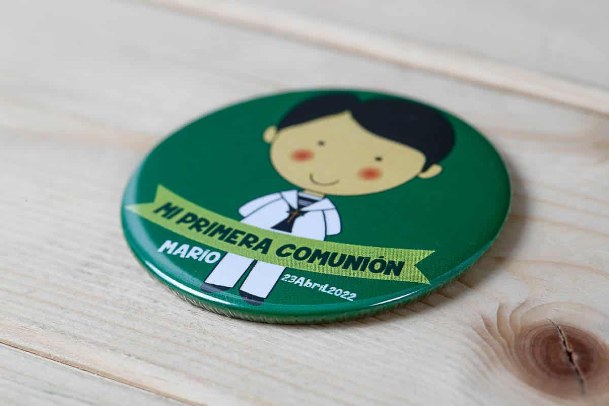 Un recuerdo original para todos los asistentes a la Comunión de tu hij@. Estuvieron presentes en la Primera Comunión y con estas chapas se llevarán un recuerdo persoanlizado y útil porque, además de la clásica trasera de alfiler, podrás convertir tu chapa en un imán para la nevera, un abridor con imán para abrir tus botellines o un bonito y práctico espejo para que siempre viajen en el bolso de las mujeres.