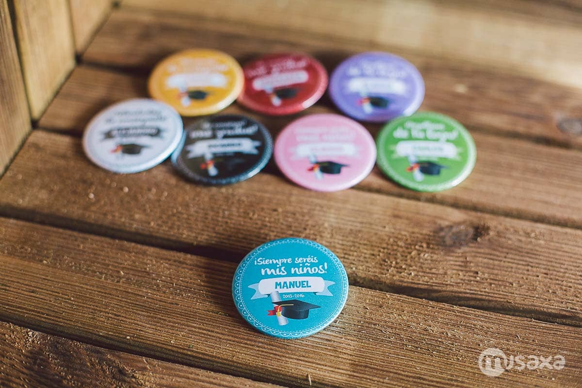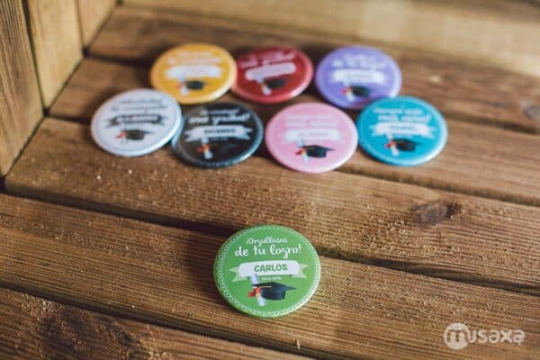 Si quieres tener un detalle con cada uno de los niños (o menos niños) que han superado el curso, te presentamos una colección de chapas para graduación con 8 colores diferentes y 4 frases. Podrás elegir el color y la frase asociada. Además, si deseas tener tu propia frase, tienes un modelo para que la personalices a tu gusto, ¿a qué esperas?.